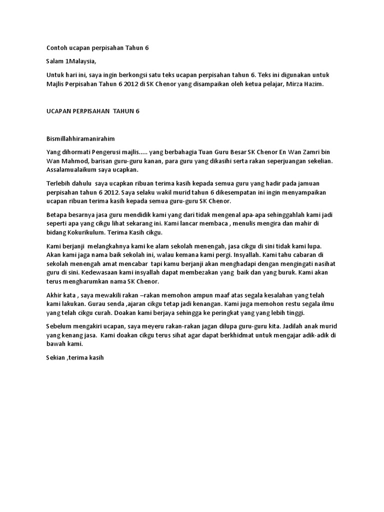 Contoh Ucapan Perpisahan Tahun 6 Pdf